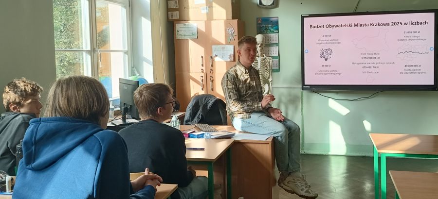 W dniu 25 września 2025 roku, na zaproszenie nauczyciela wiedzy o społeczeństwie, dr Adriana Bieli, działacz społeczny Łukasz Puła przeprowadził warsztaty dotyczące partycypacji społecznej, na przykładzie realizacji Budżetu Obywatelskiego Miasta Krakowa. Zajęcia cieszyły się ogromnym zainteresowaniem. Uczniowie mogli w praktyczny sposób dowiedzieć się czym jest budżet obywatelski, jak opisywać i zgłaszać projekty, jak przebiega głosowanie oraz jakie projekty zostały przyjęte do tegorocznej, już dwunastej, edycji BO.