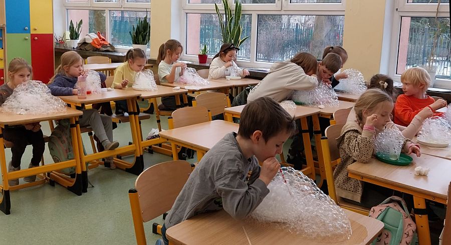 Pod koniec stycznia w klasach 1-3 odbyły się kolejne cykliczne warsztaty fizyczno – chemiczne prowadzone przez firmę RoboTim na temat napięcia powierzchniowego i jego właściwości. Dzieci eksperymentując badały fizyczne zjawisko występujące na granicy cieczy i gazu (lub innej cieczy), sprawiające, że powierzchnia zachowuje się jak elastyczna błona. Warstwa powierzchniowa jest sztywniejsza, co pozwala utrzymać małe, gęstsze od wody przedmioty, w tym przypadku karty magnetyczne. Napięcie powierzchniowe ma kluczowe znaczenie w przyrodzie (transport wody w roślinach), technice (smarowanie) oraz w życiu codziennym (mycie, bańki mydlane). Ogromne i liczne bańki mydlane wywołały u uczniów eksplozję radości. Nauka bywa przyjemnością.