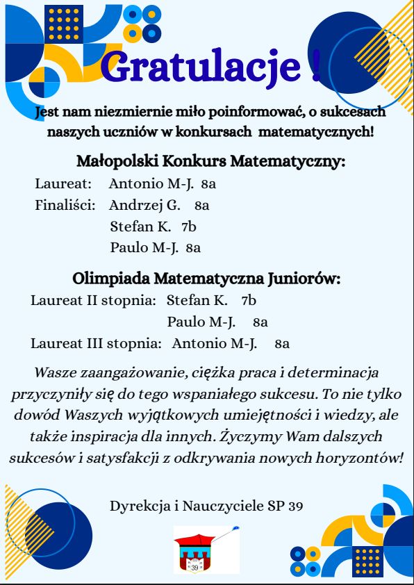 W dniach od 16 do 19.03.26 r. przyjmujemy w SP39 gości z zaprzyjaźnionej szkoły z północnej Grecji. Siedmioro uczniów i troje nauczycieli z Gimnazjum nr 6 w Katerini pod Salonikami, realizując swój unijny projekt Erasmus + na temat zrównoważonego rozwoju, zwiedza naszą szkołę, uczestniczy w zajęciach, warsztatach, zabawach i tańcach. Zaproszeni goście poznają kulturę, historię i zabytki Polski w czasie wycieczek krajoznawczych po Krakowie. Aby uczcić ich przyjazd uczniowie klas piątych przygotowali specjalny pokaz strojów, przedstawiających bogów greckich - postaci z mitologii, którą obecnie omawiają na lekcjach. Klasa 8b oraz goście przedstawiali w poniedziałek zagadnienia związane z ekologią i ochroną środowiska w Krakowie, w Katerini, w Polsce i Grecji. Kółko plastyczne z kolei wraz z greckimi rówieśnikami uczestniczylo w ciekawych warsztatach z nutą ‚eko’ na temat Krakowa :) Nasi szkolni przewodnicy z klas 6-8 pokazali też greckim gościom naszą szkołę, wszystkie nowoczesne rozwiązania, jak i nasze przywiązanie do tradycji, czego wyrazem jest szkolne mini- muzeum: Izba Pamięci :)