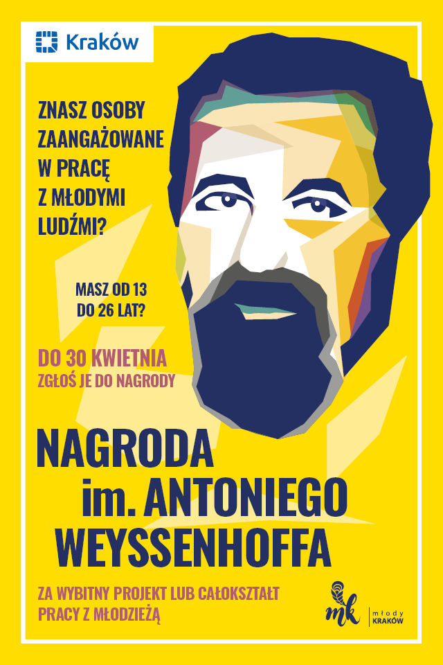 Na prośbę Wydziału Polityki Społecznej, Równości i Zdrowia Urzędu Miasta Krakowa przesyłamy informacje o możliwości zgłaszania przez młodzież kandydatów do Nagrody im. Antoniego Weyssenhoffa, przyznawaną osobom pracującym lub działającym na rzecz młodzieży w Krakowie. Jest to nagroda ustanowiona przez Prezydenta Miasta Krakowa w 2021 r.