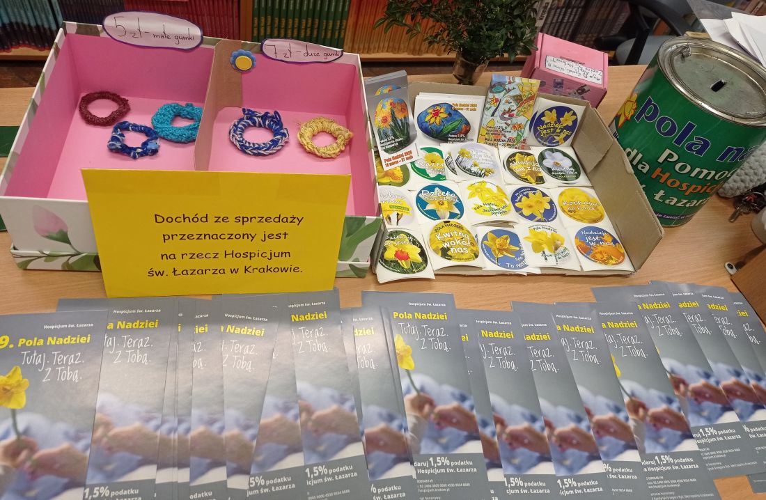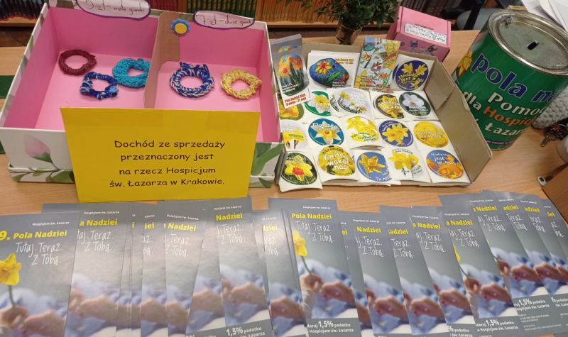 Grupa uczennic z kl. 3b i 6b wpadła na świetny pomysł, jak wykorzystać umiejętność robienia na szydełku i zorganizować akcję charytatywną. Maja, Zuzia, Nina, Janina, Stefaniia i Ala wymyśliły dzierganie z wełny ozdobnych gumek do włosów. Dziewczęta przygotowały różnokolorowe, szydełkowe cudeńka i rozprowadzały je wśród uczniów, nauczycieli oraz rodziców. W czasie trwania tej akcji udało się Im uzbierać 1061,55 zł! Cała kwota zostanie przekazana na rzecz Hospicjum św. Łazarza w Krakowie.